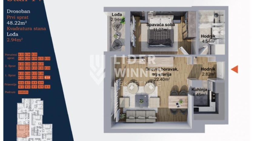Strukturu stana čine dnevni boravak sa trpezarijom i kuhinjom, spavaća soba, kupatilo i lođa.