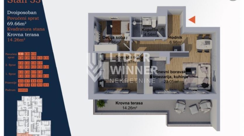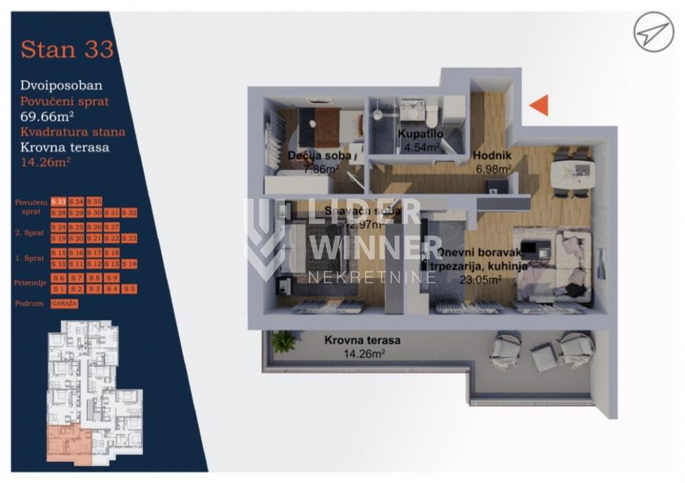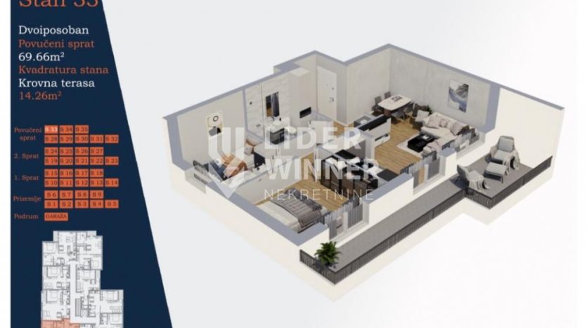 Strukturu stana čine dnevni boravak sa trpezarijom i kuhinjom, 2 spavaće sobe, kupatilo i terasa.