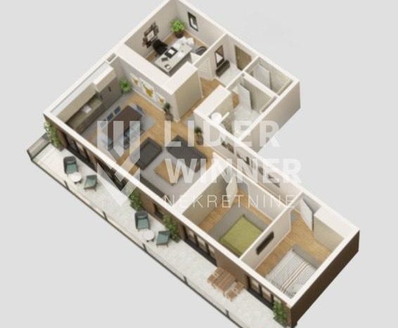 Strukturu stana čine dnevni boravak sa trpezarijom i kuhinjom, 3 spavaće sobe, kupatilo, toalet i terasa.