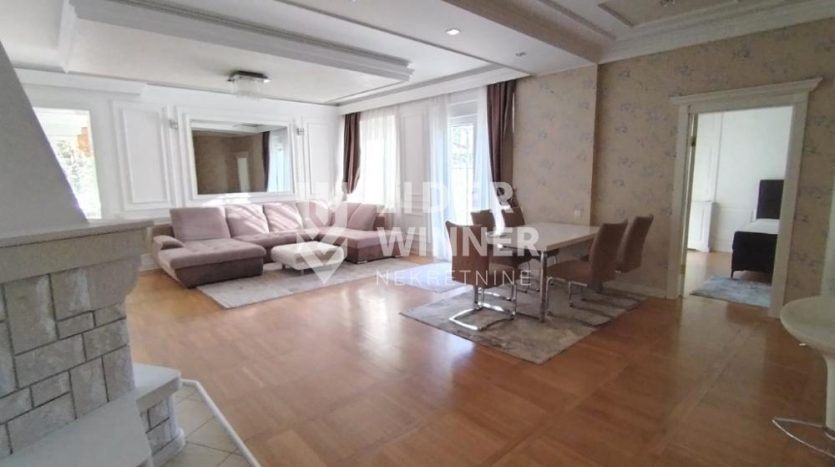 Prostorije: hodnik, prostrana dnevna soba sa prirodnim kaminom, antre, 3 spavace sobe, mala radna soba, 2 kupatila, 2 pomocne prostorije, kuhinja sa sankom, prostrana terasa (100m2) sa fontanom.