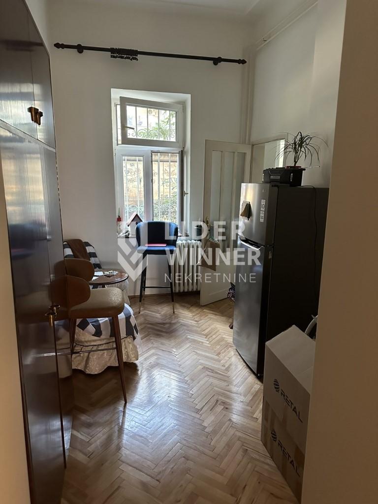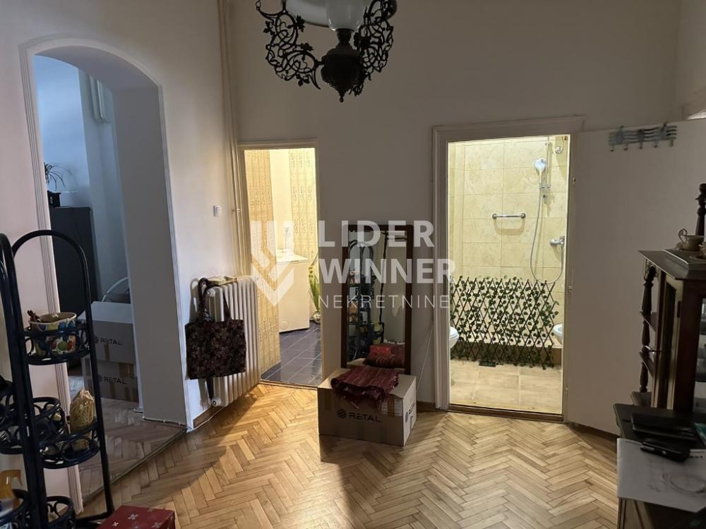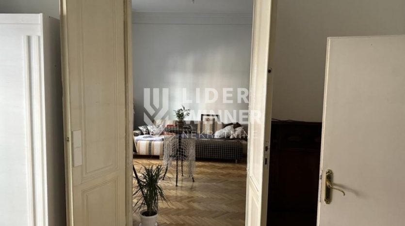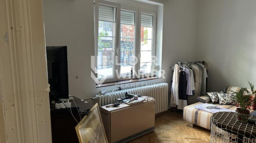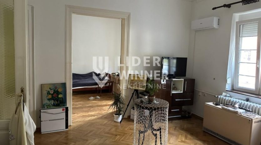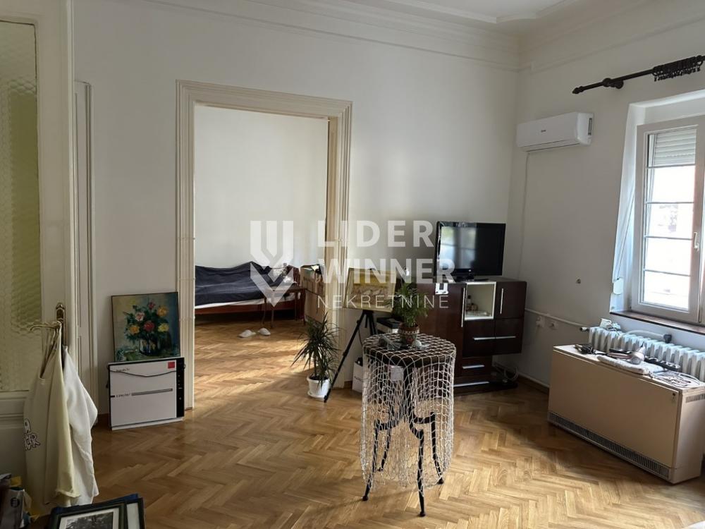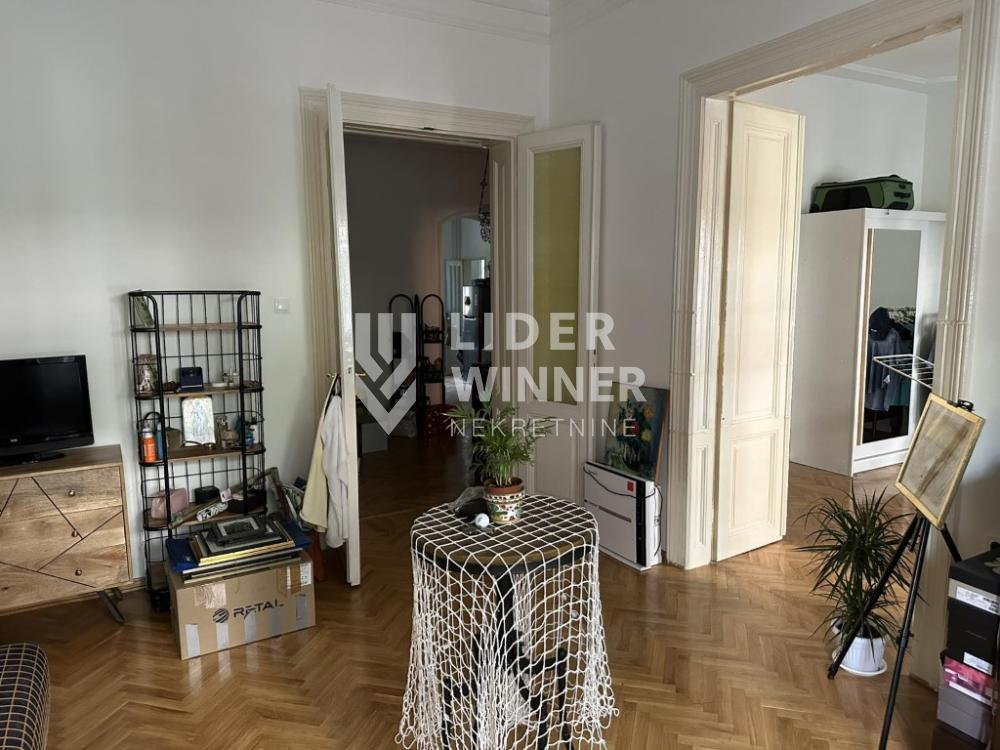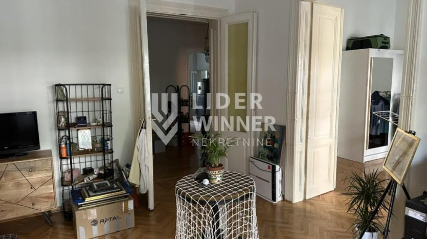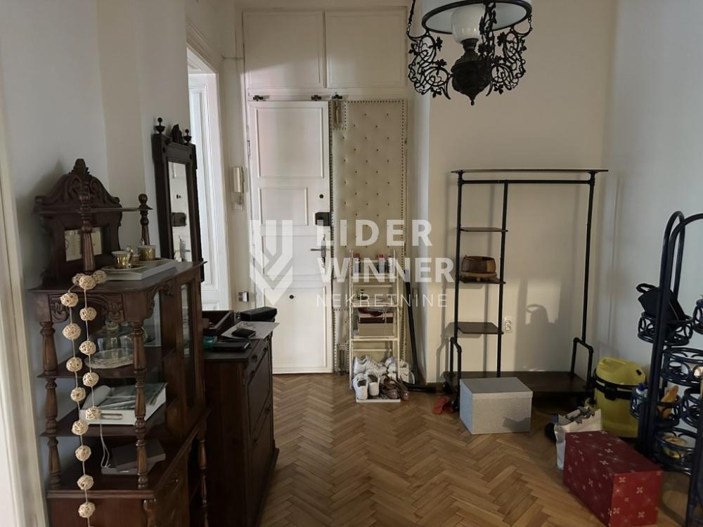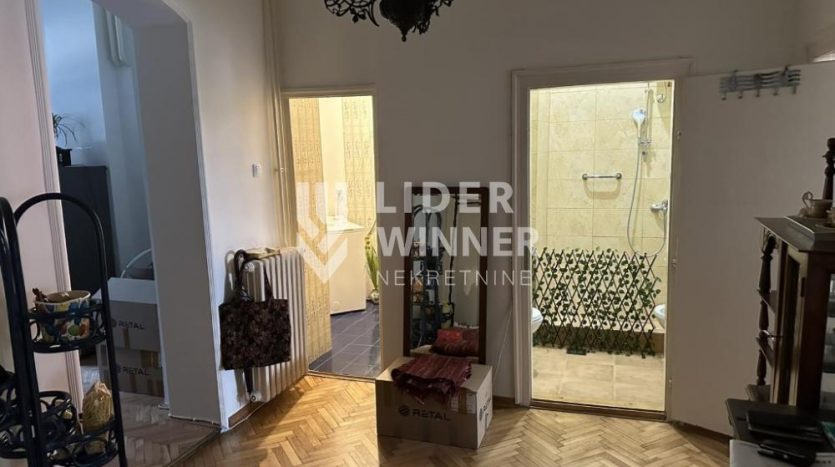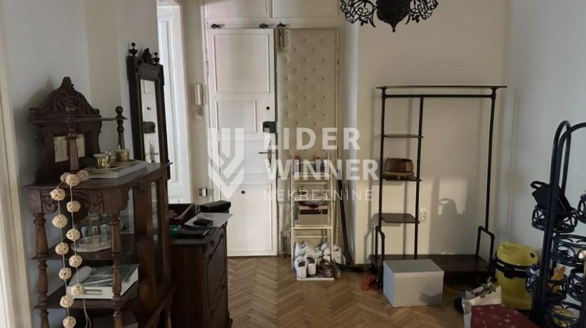 Antre – salon iz koga se ulazi u sve prostorije: kupatilo, toalet i trpezarija iz koje se ulazi u kuhinju, dve velike sobe koje gledaju ka ulici, . Vlasnici jedini imaju pristup dvorištu od 20m2. Stan je jednostrano orijentisan I-Z, visina plafona je 3,55m, sa spuštenim plafonima. RENOVIRAN, spoljašnja stolarija je PVC, a unutrašnja stolarija je originalna i očuvana, parket je očuvan klasični, grejanje je TA (ima kotao za etažno grejanje na struju i sprovedene radijatore), klimu, interfon, video nadzor, kablovsku, podrum.