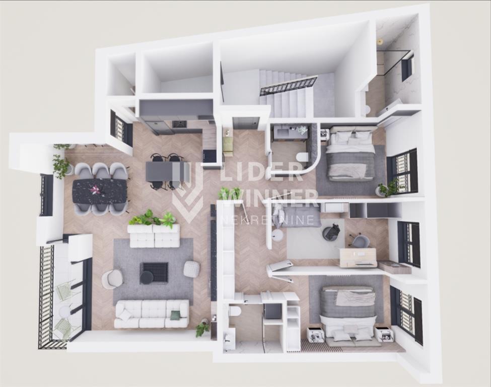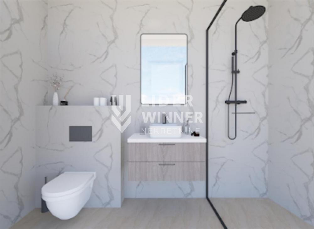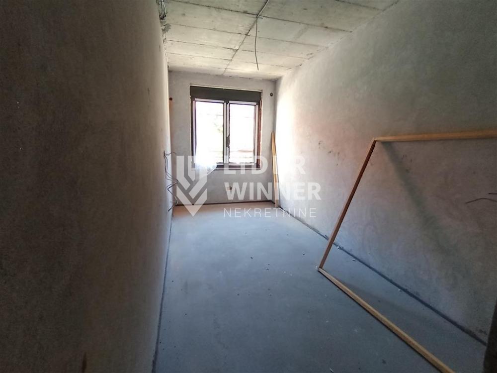 Prostorije: ulazni hodnik, gostinjski toalet, dnevna soba sa kuhinjsko- trpezarijskim delom i izlazom na terasu (5,5m2), ostava, spavaća soba sa zasebnim kupatilom 4-5m2, spavaca soba (15m2), spavaca soba (12,5m2), kupatilo.