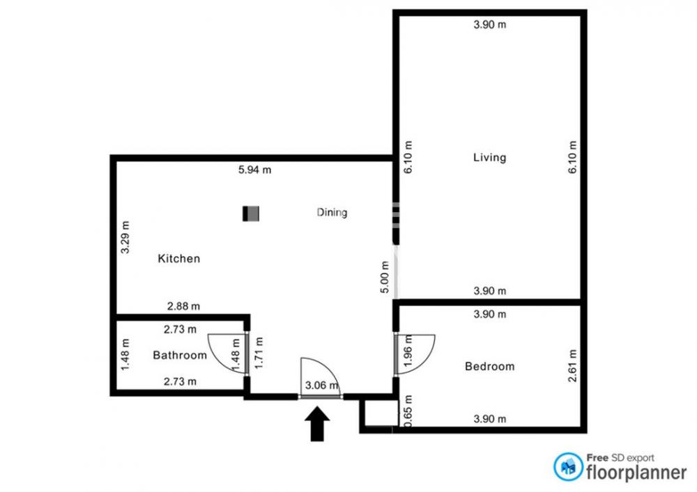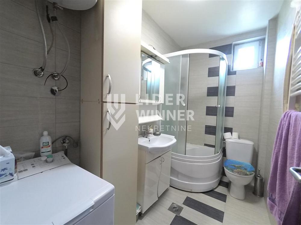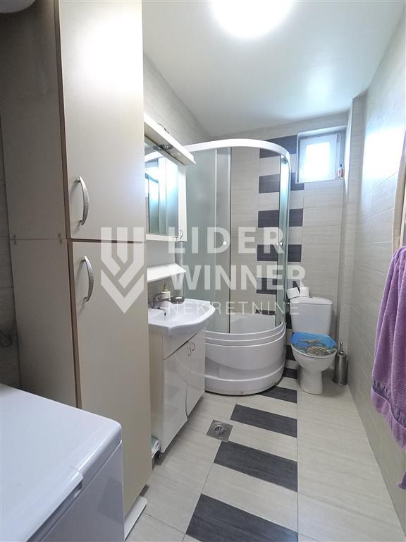 Prostorije; ulazni deo sa plakarom, trpezarija sa kuhinjom, dnevni boravak, spavaća soba, prostrano kupatilo sa prozorom i tuš kabinom