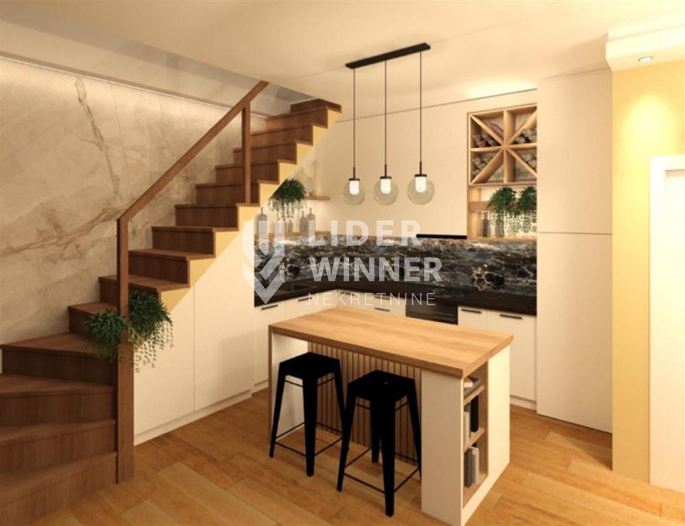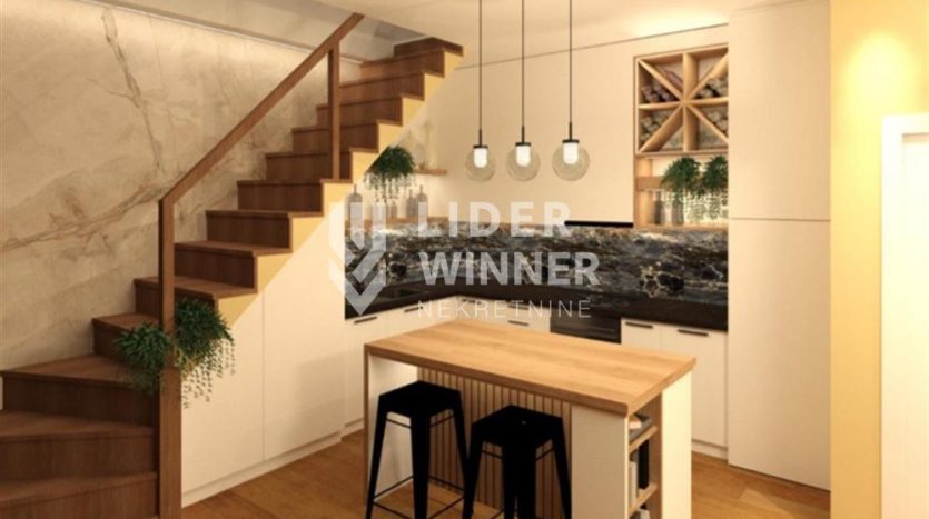 Stan se prostire na dva sprata. Strukturu stana čini dnevni boravak sa kuhinjom i trpezarijom, kupatilo, a na spratu spavaća soba.
