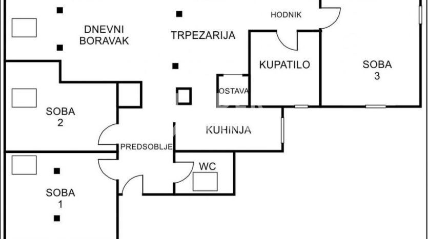 Sastoji se iz velikog open space koncepta dnevne sobe sa kuhinjom i trpezarijom,2 mokra cvora,3 spavace sobe,ostave i hodnika.