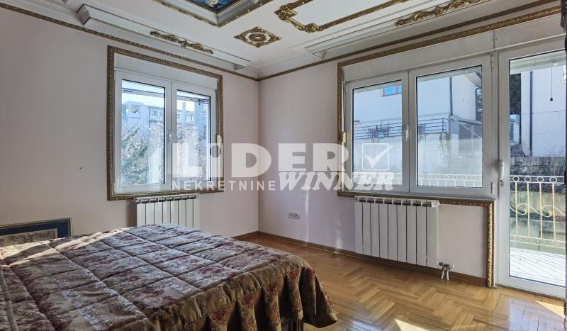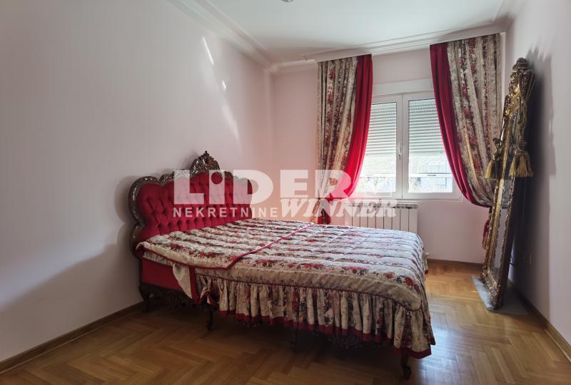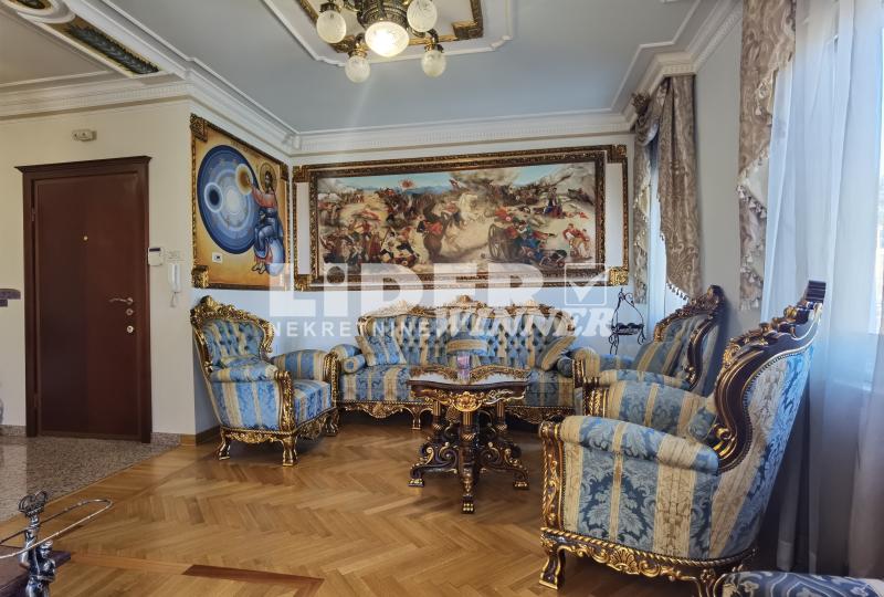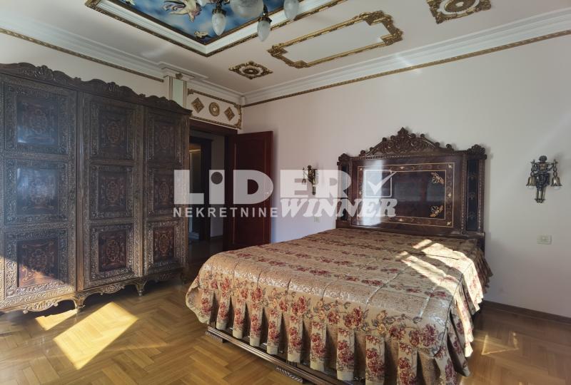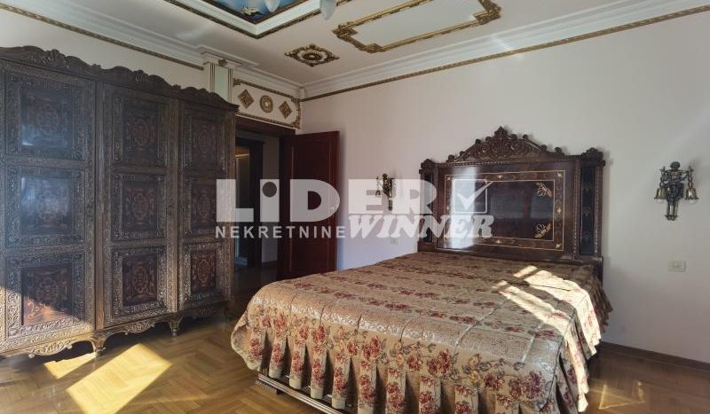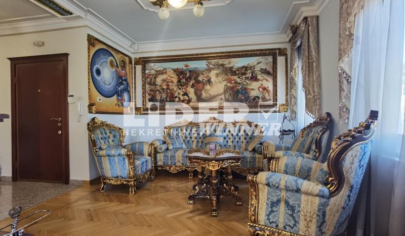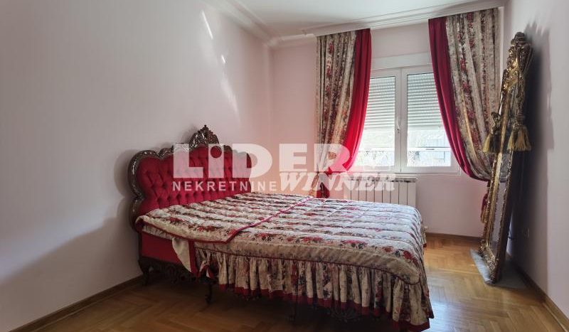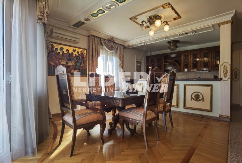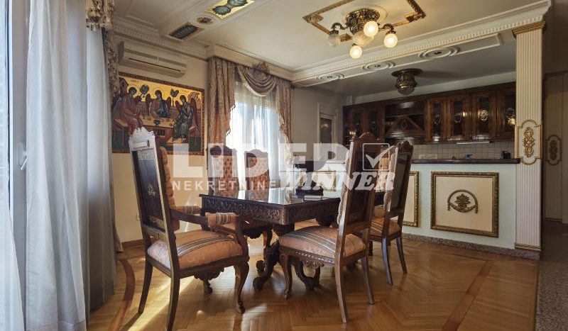 Na Dedinju kod Belog dvora nalazi se ovaj lux stan četvorosoban po strukturi. Kompletno namešten posebnim komadima stilskog nameštaja , umetničkih slika. Odlično organizovan sastoji se iz antrea , gostinjskog toaleta , dnevnog boravka, trpezarije, kuhinje, tri spavaće sobe, kupatilom a poseban deo čini sauna sa tuš kabinom kao mestom za relaksaciju i odmor. Stanu pripadaju garazno mesto, parking mesto i ostava. agencijska provizija 50%
