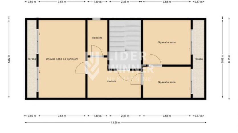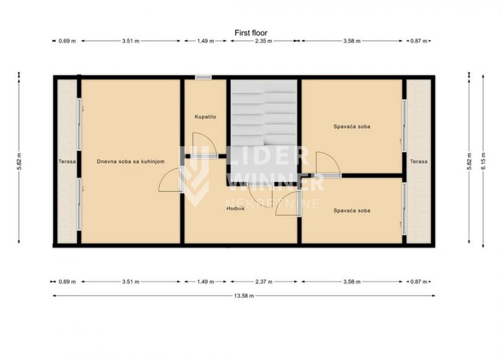 I sprat – dnevni boravak, kuhinja sa trpezarijom, terasa, kupatilo, 2x soba, terasa. agencijska provizija 2%